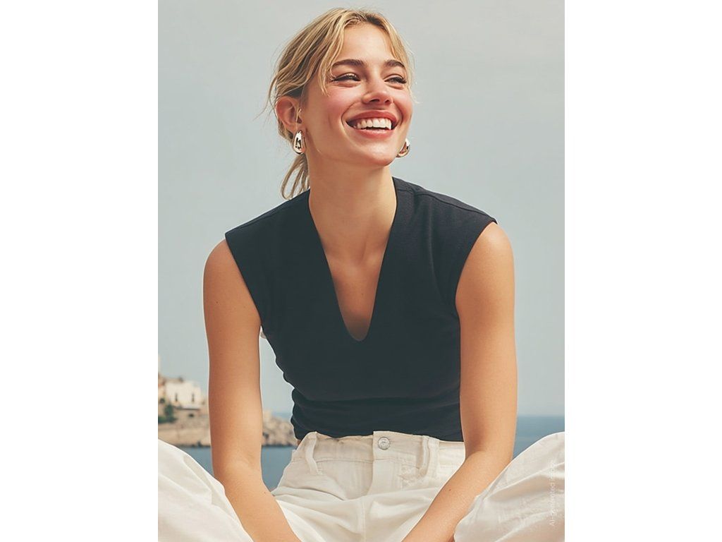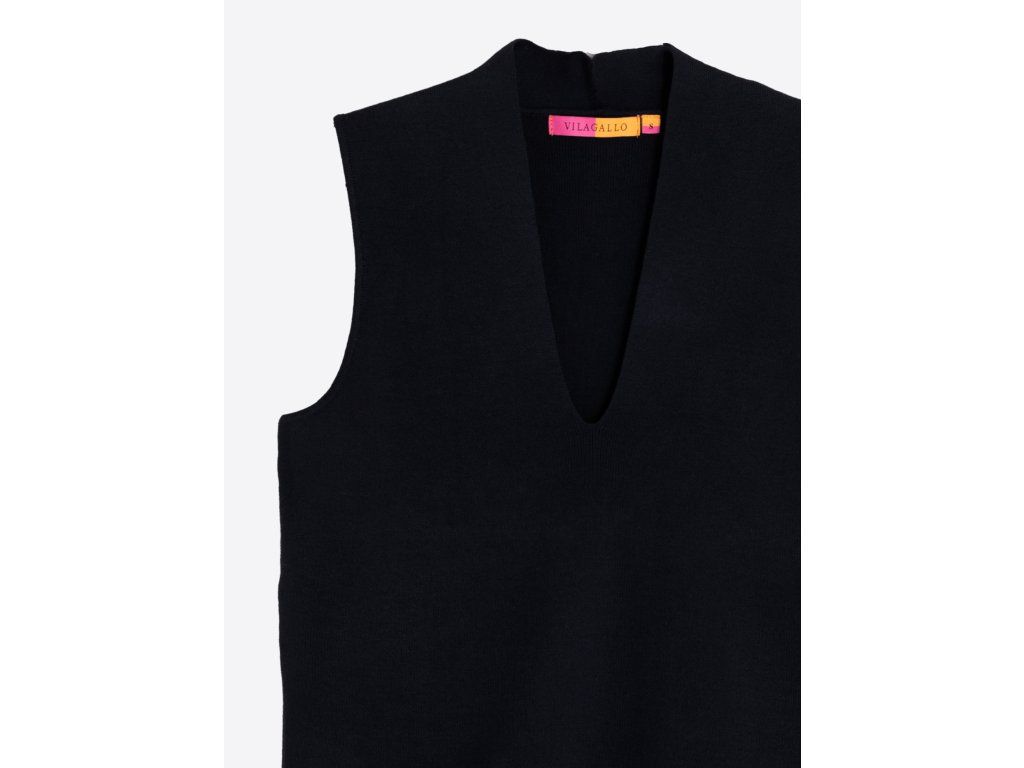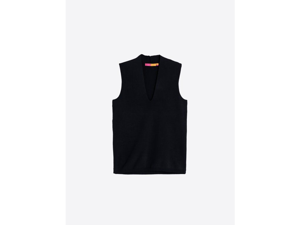 Černý top bez rukávů s výstřihem do V. Vyroben z hladkého úpletu s rovným střihem.