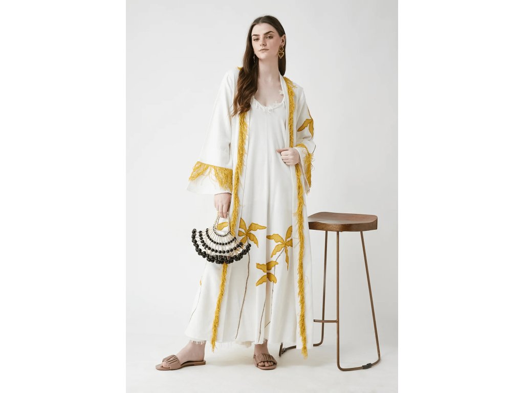 Představujeme dlouhé bílé kimono Horizon – ztělesnění luxusu a elegance. Toto dlouhé kimono, vyrobené z měkké bavlny, je ideální na den na pláži nebo na letní dovolenou. Zdobené jemnou výšivkou, je dodáváno s páskem pro vytvoření slušivé a krásně ženské siluety. Objevte krásu ženskosti a stylu.