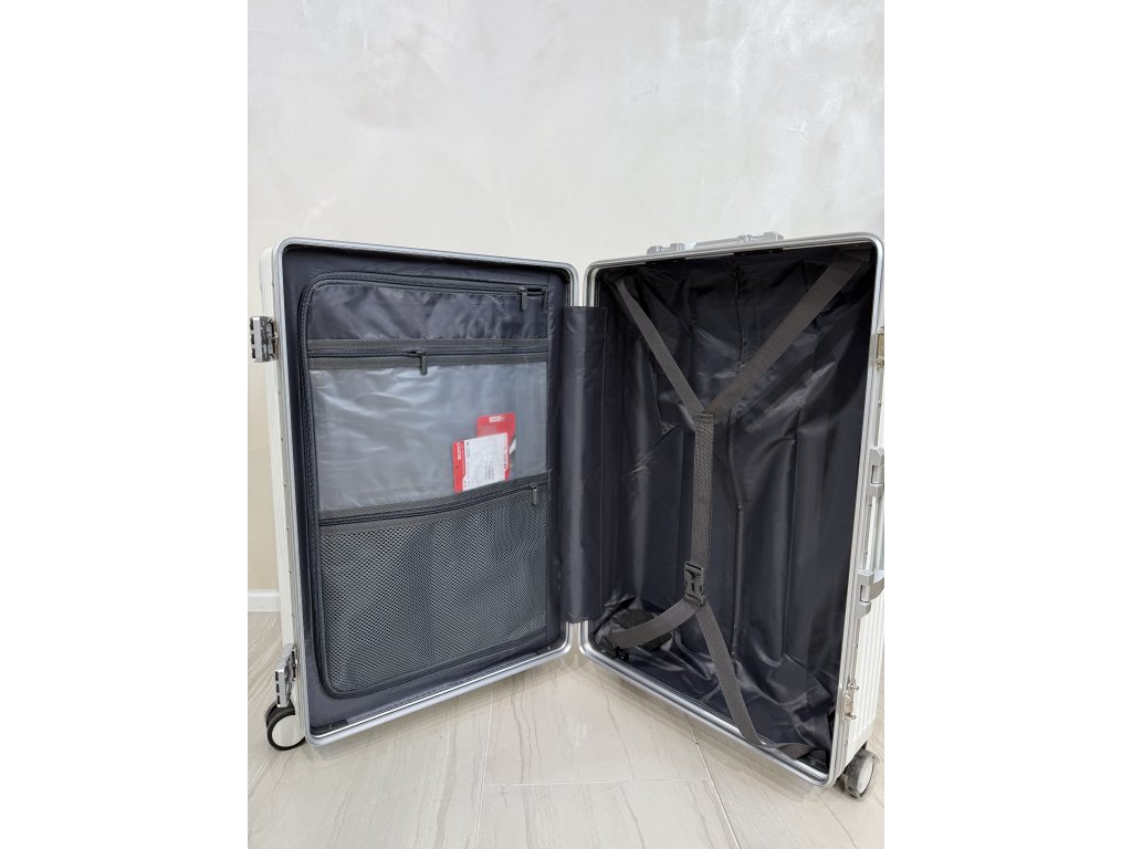Kufr má klasické vnitřní uspořádání s několika přihrádkami na zip.